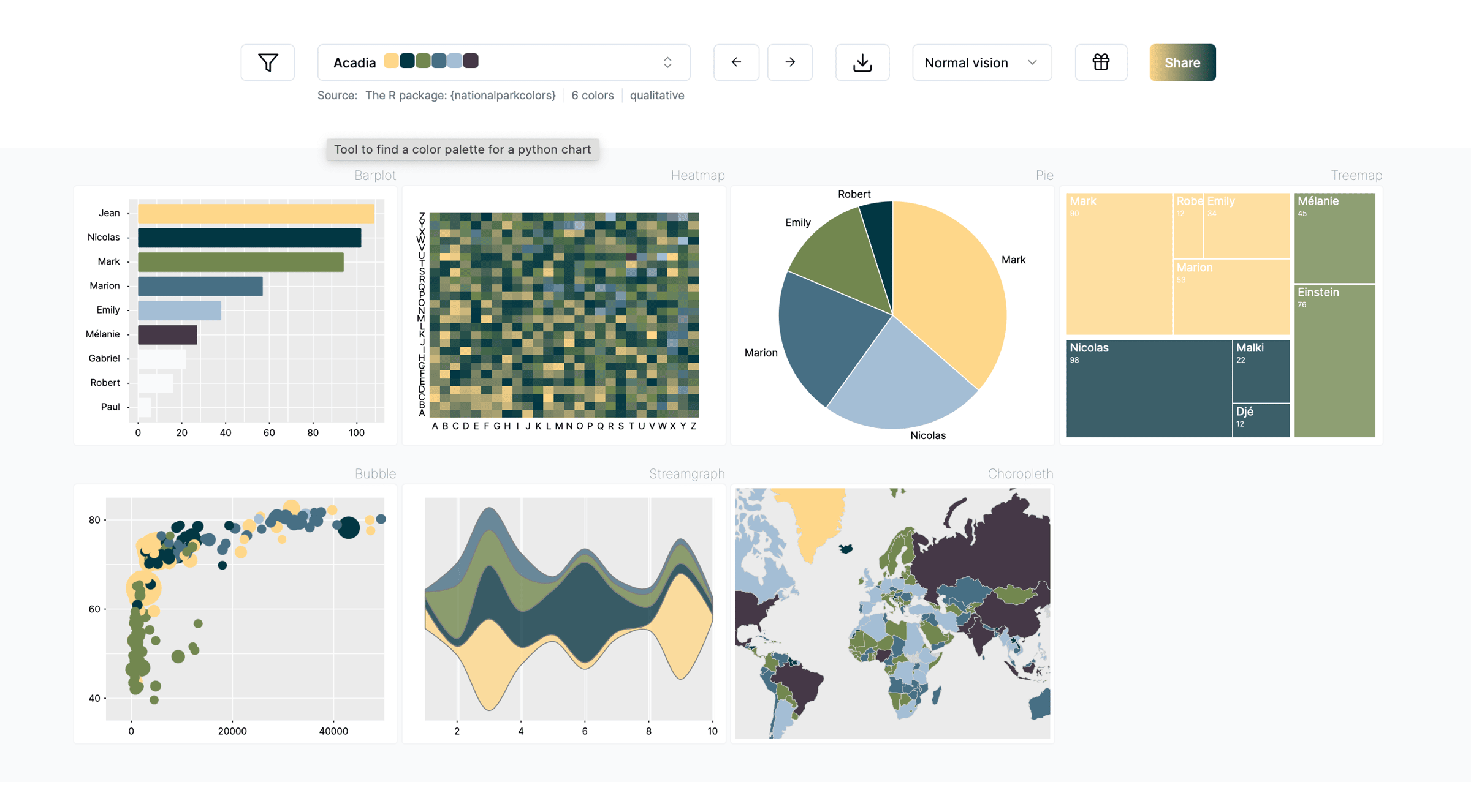 Finding a good palette is always painful. Many options exist, but they are scattered everywhere. The palette finder lets you browse hundreds and preview them on example charts.