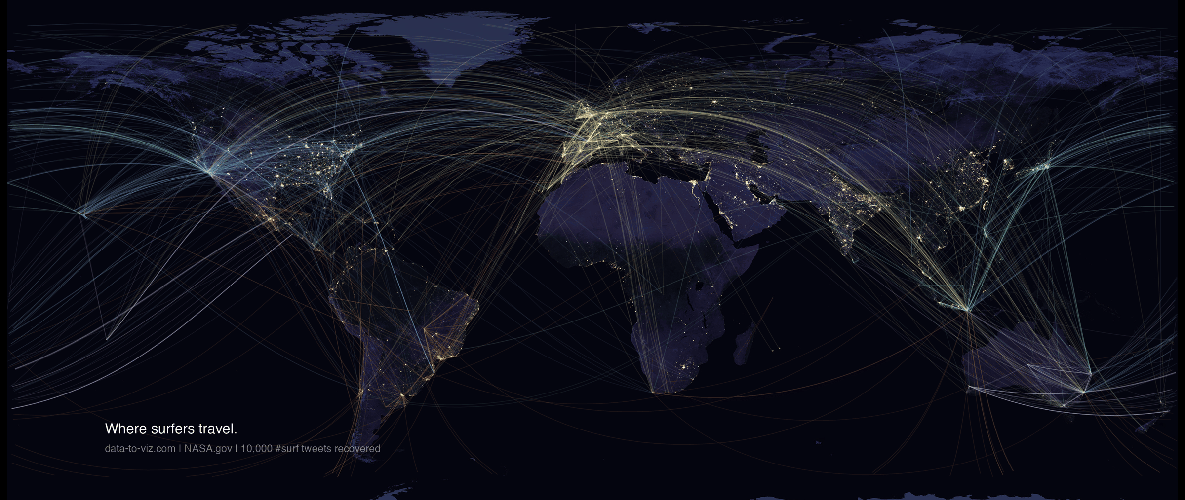 About 90% of the decisions I take in life are driven by surfing, which does not always lead to the best choices. At some point I had to find a way to connect it with dataviz. I built a bot that harvested all the tweets containing the #surf hashtag, then extracted the home and current location of the authors to build this map.