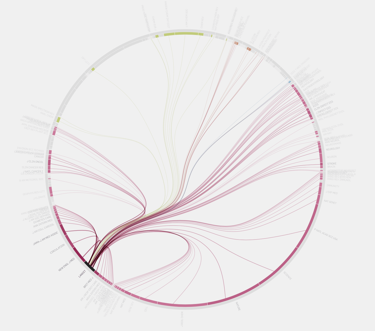 This is my favorite chart type. It is mesmerizing. This stunning example by Moritz Stefaner shows connections between scientific papers.