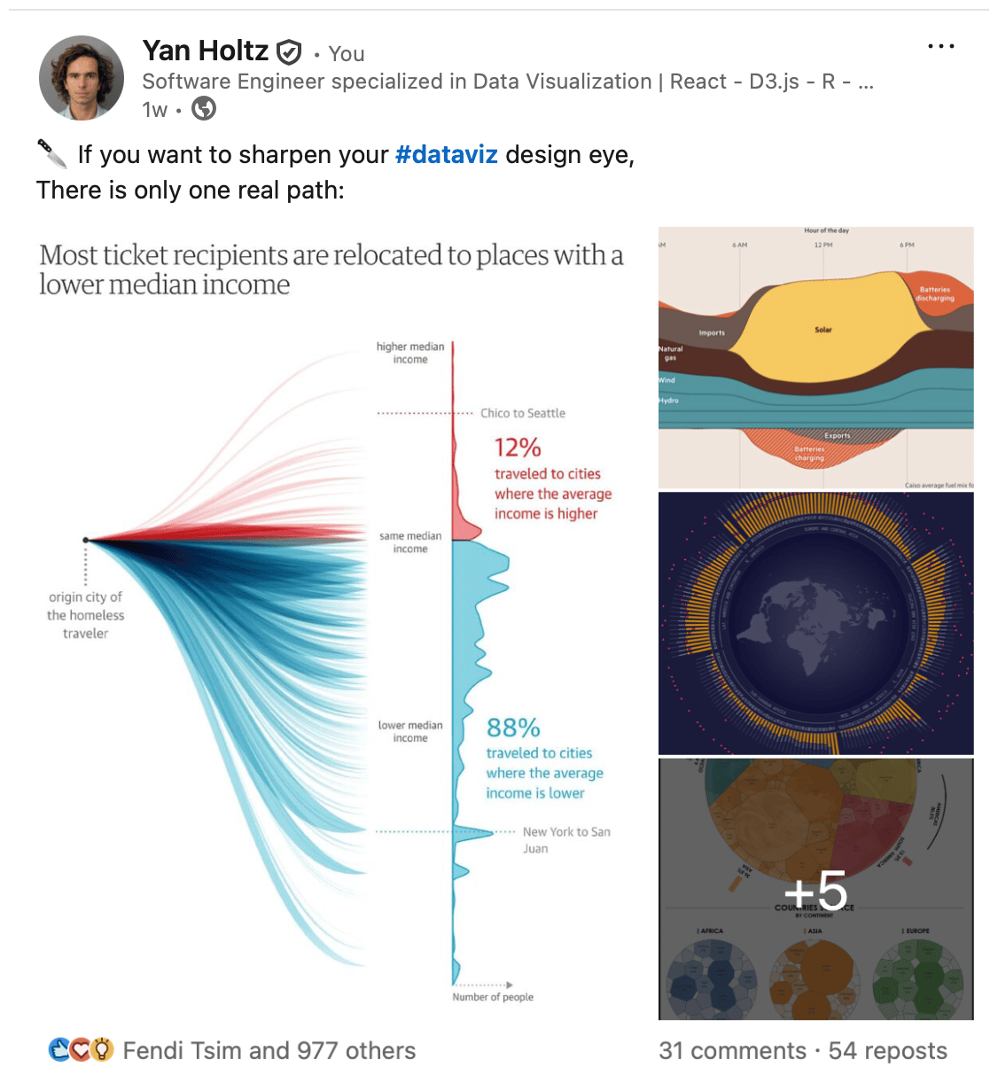 β Struggle 2: GhostedSomeone reaches out with a dataviz project. After a few messages, the need is clear. I can solve the problem. We agree on budget and timing. One or two meetings follow. Then nothing. It is frustrating to invest time, sometimes block calendar slots, and then get ghosted with zero feedback. You stay completely in the dark, not knowing what went wrong, or if anything went wrong at all. I am slowly realizing that this is actually very common. π β β Struggle 3: Swiss knifeThe skill set required to freelance in dataviz is pretty wild. Of course, you need strong technical skills and a way to prove them. But you also need to be a salesperson. You have to communicate clearly, run meetings, convince people. And I am not even talking about the administrative load, which is quite heavy in France. On the technical side, the scope is just as wide. Some clients want pure frontend work with React and D3.js. Others need data analysis with R, Quarto, some statistics, and a lot of data wrangling. Recently, I have even been asked to do pure design work. This one hurt a bit. I rely heavily on Excalidraw to sketch future outcomes. It is perfect for thinking through structure, hierarchy, and which information goes where. But it does not look like a polished end product. A client was recently disappointed by this, expecting something closer to a Figma file that looks production ready. Being asked to be both a real designer and a real developer is pretty intense. If you are freelancing, be ready to spend a lot of time outside your comfort zone. Struggle 4: Time frameFor five years, I worked in a big tech company where everything moved fast. A project could go from idea to production in four weeks. We had daily meetings. Decisions were made on the fly. In December 2023, I signed a contract with a government. The goal was to build a pipeline that lets them generate Quarto reports in minutes when an environmental threat occurs. A very exciting project, initially planned to end in March. We are still working on it today, after a roughly six month pause! No one is at fault, neither them nor me. But it is a good reminder that, as a freelancer, timeline management can quickly become a real headache. β Struggle 5: Mental loadI probably work fewer hours than when I was a full time employee. But the mental load is not comparable. As a freelancer, you are always thinking about the next contract, the post that could attract interest, the student who needs access to a course. It is your business. You are fully responsible for it. And if you do not take care of it, no one else will. β The bottom lineAgain, I am not complaining. My day to day work is genuinely exciting! I spend most of my time doing what I love. I get to talk with smart, diverse, inspiring people. I feel like I am playing a game with no real limits. I also feel useful: student feedback on the courses is incredibly rewarding. And most importantly, I am in control of my time. Being able to go surfing at 3 pm on a Tuesday, then work until midnight if I want to, is a way of life I never want to give up. That said, this path is clearly not for everyone. Take the time to think honestly about what works for you. Do not blindly buy into the LinkedIn narrative claiming you are wasting your life if you are an employee. Especially when it usually ends with someone trying to sell you a course. One last thought. It is striking how our brains give far more weight to what goes wrong than to what goes well. Last week, I had two disappointments. But I also received many great testimonials from 170 recent students and signed a new freelance contract. So if you had a bad week too, let us try to focus on what is going right. Yan PS: Sorry for drifting away from pure dataviz content today. That is simply what was on my mind tonight π€·ββοΈ