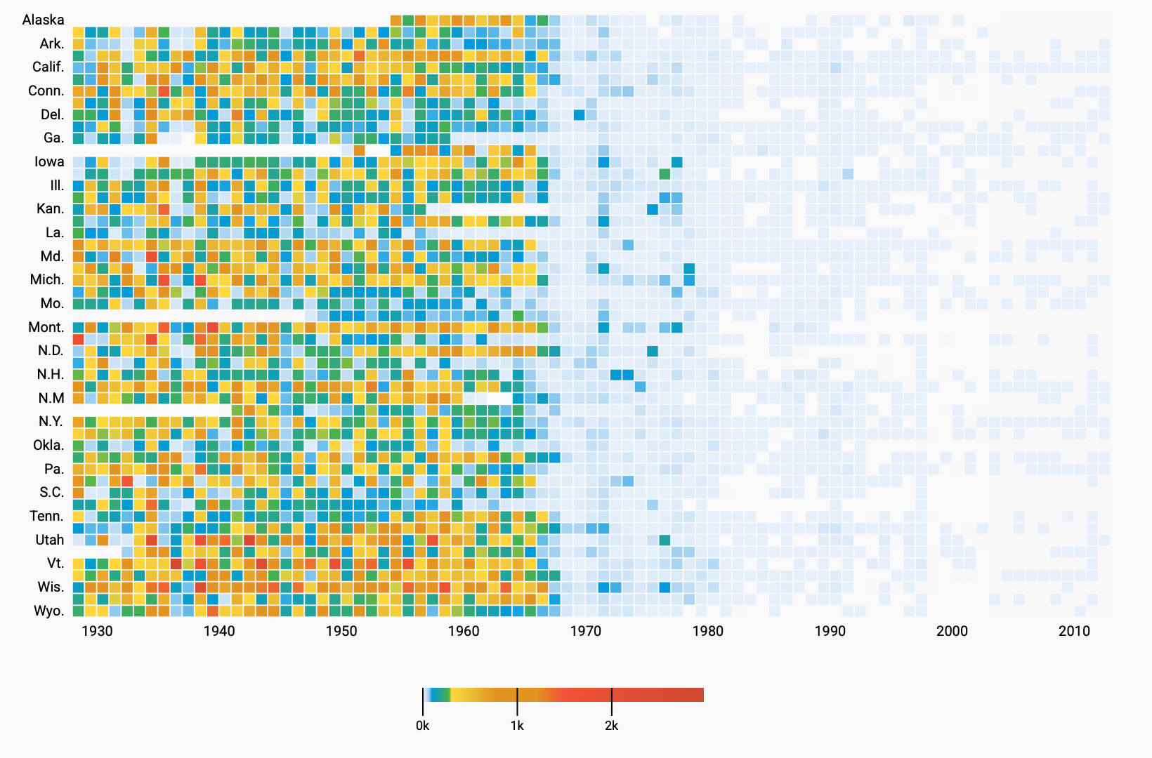 One of the most famous heatmap example. Shows the vaccine effect on Measles. D3 code.