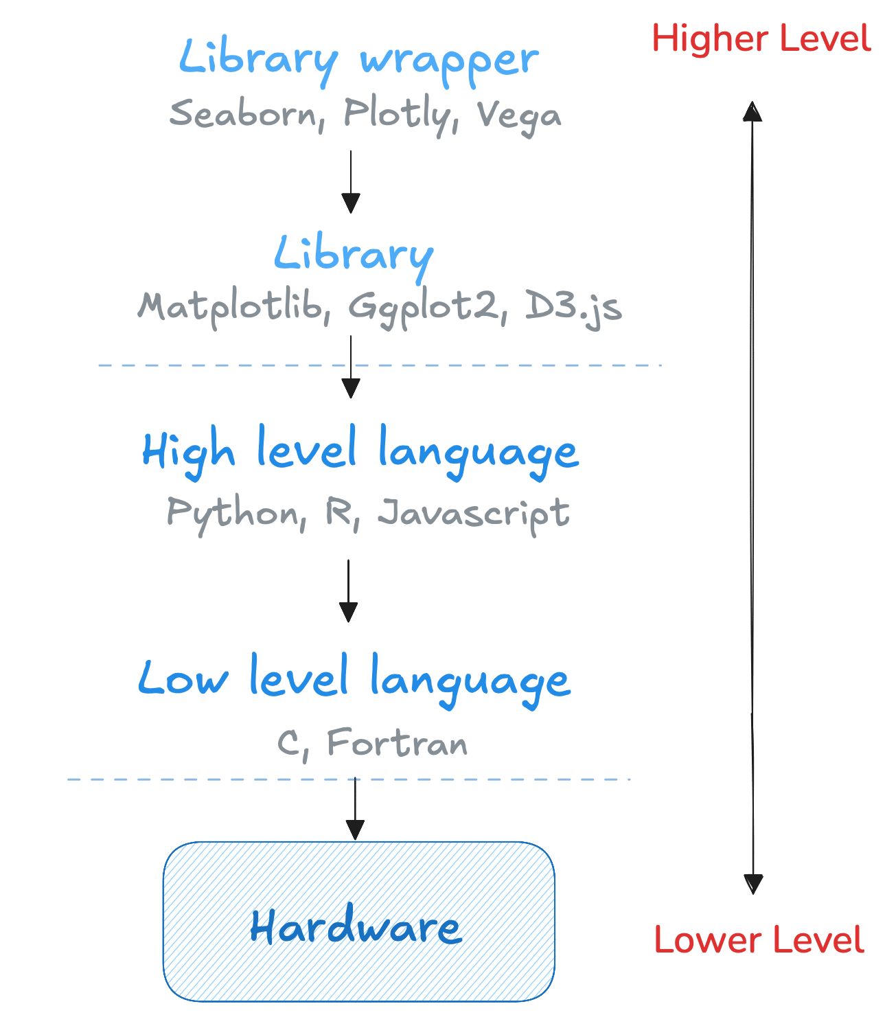👋 Hi! My career started as a plant geneticist. I dove into code progressively, and I've always been surrounded by people who were better programmers than I was. There’s a concept they often talked about: low-level vs high-level programming. 🤔 You’ve probably heard about this too! Today I suggest we see what it means and how it applies to dataviz. 🧩 High-level vs Low-level A computer is just hardware that executes instructions. It performs calculations when told to. At its core, it speaks...